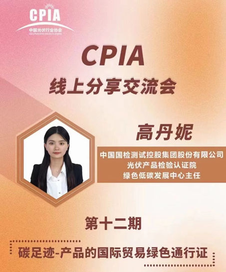近日,国检集团受邀参加中国光伏行业协会(CPIA)主办的“光伏产品碳足迹”线上研讨会,并分享“碳足迹-产品的国际贸易绿色通行证”专题报告。